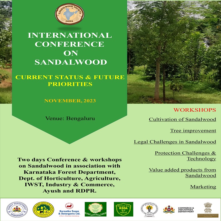 Sandalwood Society of India is conducting national/regional conferences on sandalwood thereby creating a perfect platform for addressing common issues like supply of quality planting material (qpm), pest management, and agro forestry in sandalwood plantation, trade, policy issues, logistics & protection regularly, since the gestation period of sandalwood for harvesting spread over 20-30 years.